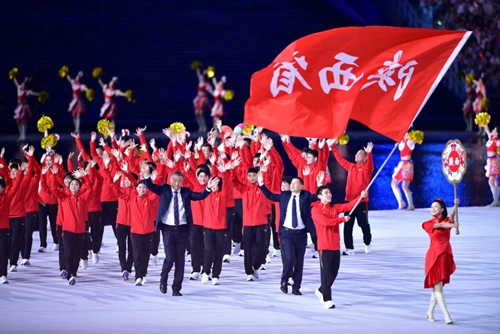 陕西体育代表团成员在杨昊挥舞旗帜的引领下,坚定有力地走入会场。激昂的陕北民歌将现场拉回到具有浓郁特色的黄土地上,“陕西是中华民族和中华文明的重要发祥地之一,陕西运动健儿将牢记嘱托、勇立潮头、感恩奋进,努力争做西部示范”。本届全运会陕西共有843人入围决赛,其中竞技体育项目374人、群众赛事活动469人,创造了省外全运会参赛人数历史新高。