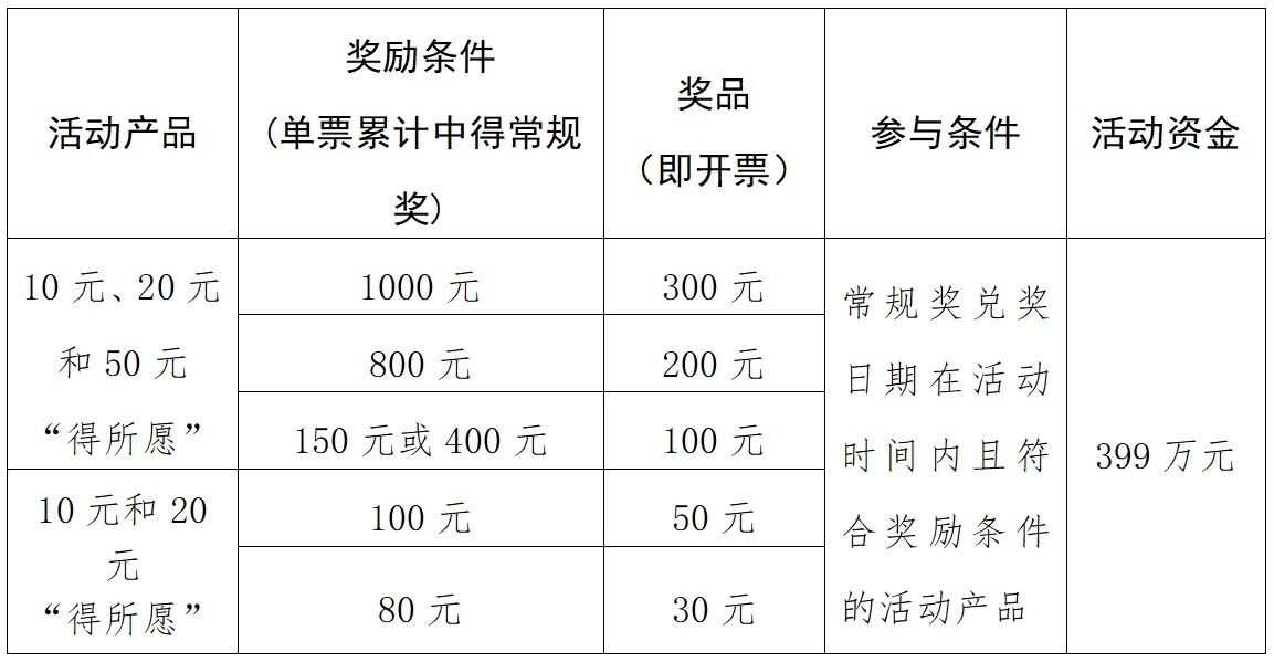 本次活动产品是:陕西省的10元面值、20元面值和50元面值的“得所愿”系列即开型体育彩票产品。具体活动规则如下: