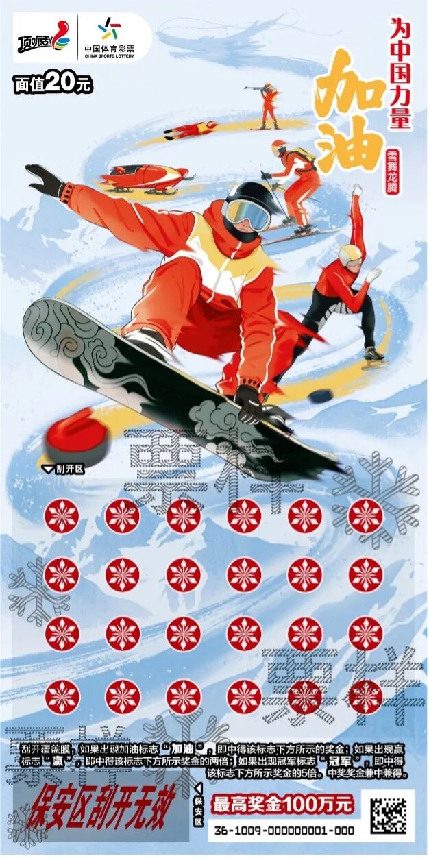 冰雪运动是即开票票面设计的重要题材。近日,体彩顶呱刮以热门冰雪运动为主题,推出“为中国力量加油·雪舞龙腾”主题即开票。这款票面值20元,共有1个票面场景。画面以冬日冷白为主色调,以中式水墨绘画笔触将运动项目串联,运动健儿在雪山之间驰骋,宛若游龙,呼应主题“雪舞龙腾”。