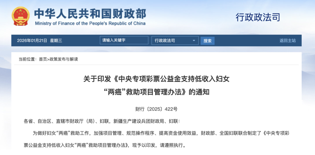 近日,财政部、全国妇联联合发布《关于印发<中央专项彩票公益金支持低收入妇女“两癌”救助项目管理办法>的通知》(财行〔2025〕422号,以下简称《通知》)。