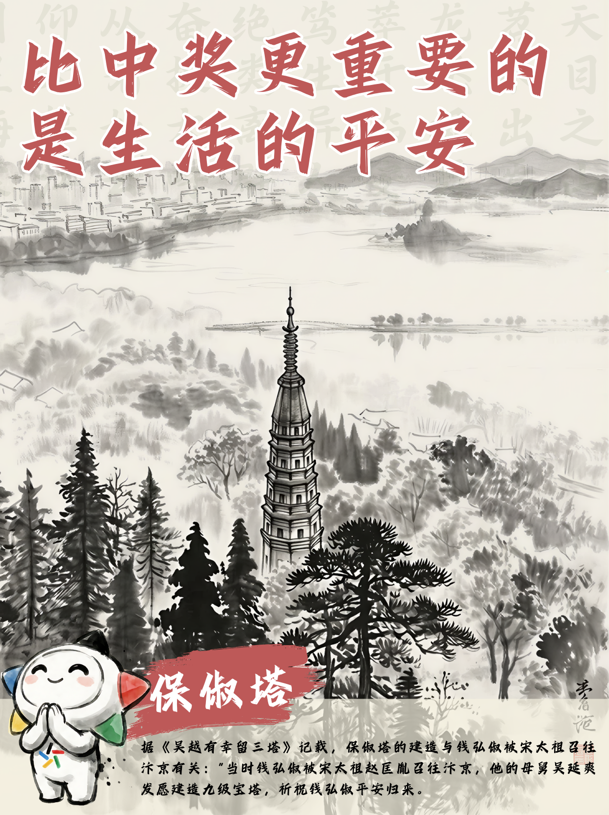 在杭州这座千年古城,钱弘俶留下的不仅是历史印记,更是一条贯穿古今的公益精神脉络。从镇守江潮的六和塔,到祈求昌盛的雷峰塔,从期盼归来的保俶塔,到钱王祠中的历史回响,这些古迹不仅见证了钱弘俶的治国智慧,也与当代中国体育彩票“来之于民、用之于民”的公益精神遥相呼应,让这份守护苍生的温情,在烟火人间里绵延至今。