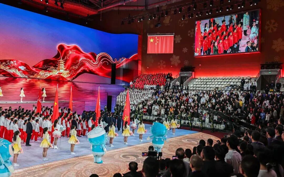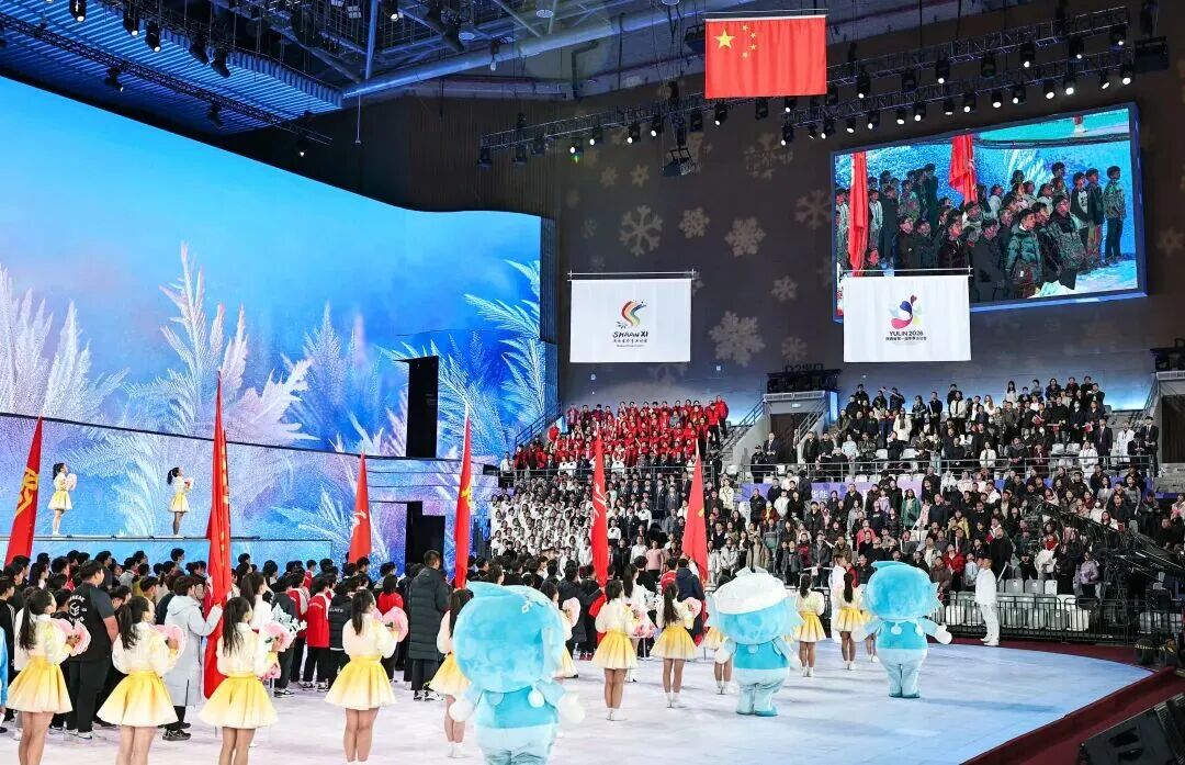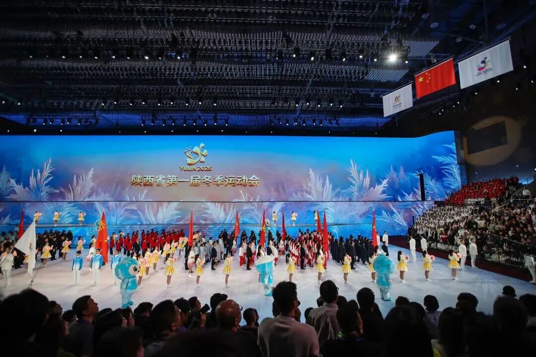 2月6日,夜幕垂落,陕西省第一届冬季运动会的主会场榆林市体育中心体育馆与分会场榆林水上运动中心华灯齐放,如两颗明珠镶嵌在塞上大地。其中,室内的主会场侧重仪式盛典与文艺展演,室外的分会场聚焦冰雪实景与竞技展示。当晚,历史与现实、冰雪与文明、黄土与激情,在榆林这座“双运之城”碰撞交融。