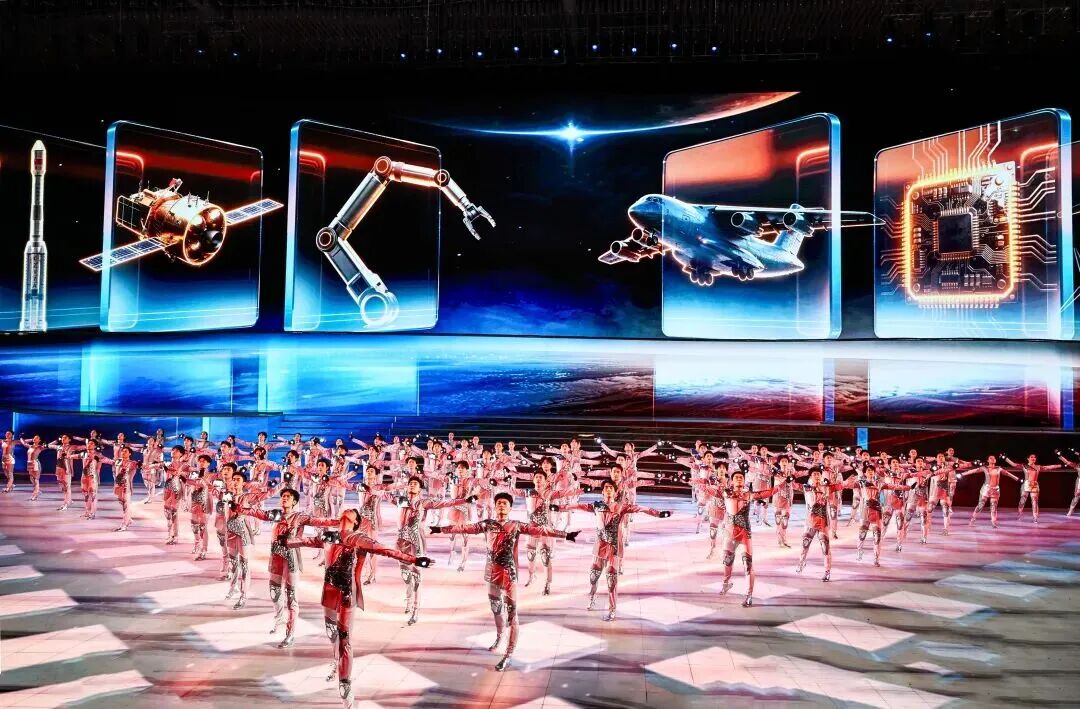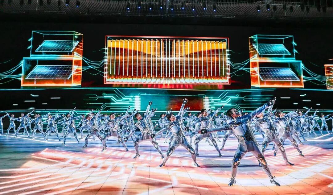 下篇《陕耀未来》以“未来”为轴,凝聚三秦儿女追赶超越谱新篇、砥砺奋进新征程的昂扬斗志,指向一片更辽阔的天地。《追赶展宏图》节目中,一株“生态能源之树”破冰而出。根系是煤矿井下智能开采的影像,枝干是太阳能板与风力发电机的抽象造型,叶片则由雪花晶体构成。舞者手持光影万花筒,折射出陕北治沙绿洲、关中科创走廊、陕南生态保护区的景象。节目《超越谱新篇》将气氛推向高潮,老中青少各代人群与陕西各地行业代表携手登台,以铮铮誓言朗诵长诗《再诵沁园春》,将冰雪运动的力量、精神与梦想升华为新时代陕西追赶超越的奋斗篇章。