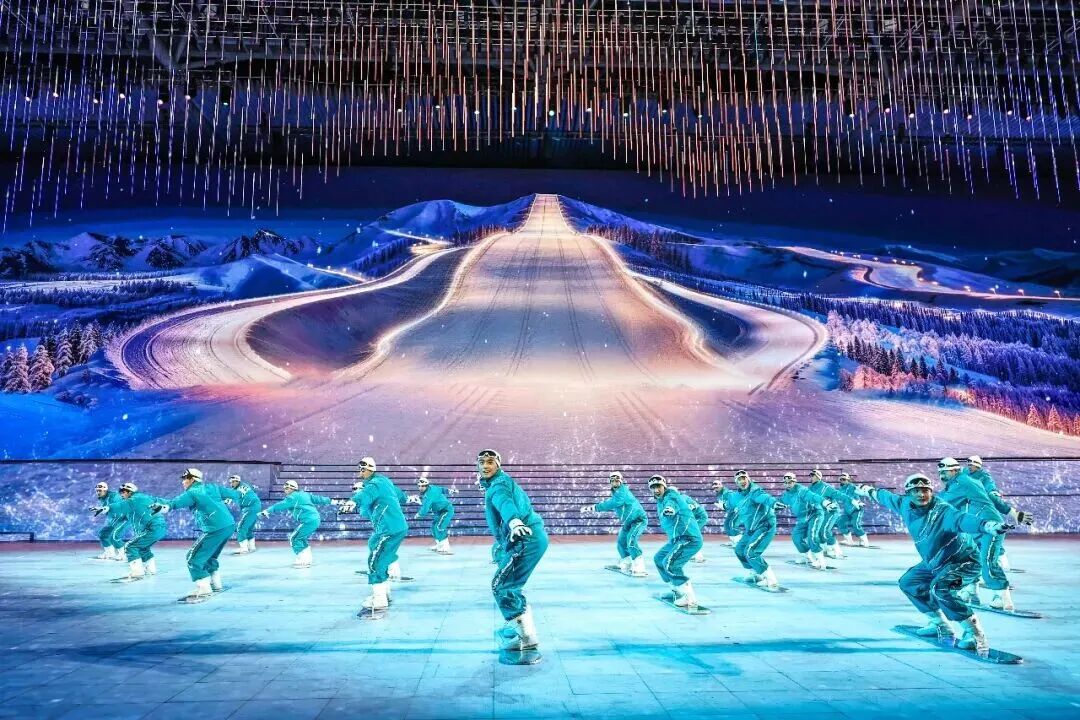 中篇《沸冬腾雪》以“运动”为景,呈现竞技冰雪运动的热血风采和群众冰雪运动的鲜活图景,将“冷运动”演绎成“热狂欢”。《冰封竞多娇》节目中,数控矩阵瞬间转换为高山滑雪赛道、速滑冰道、冰球场馆,威亚演员如飞鸟凌空,演绎跳台滑雪的惊险;地面舞者疾驰回转,再现短道速滑的激情。而《雪飘看今朝》节目将三秦大地冰雪运动融入大众生活、全民健身蔚然成风的时代画卷徐徐展开,彰显了“三亿人参与冰雪运动”的生动实践与陕西冰雪产业的无限魅力。