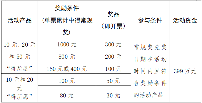 陕西省的10元面值、20元面值和50元面值的“得所愿”系列即开型体育彩票产品。