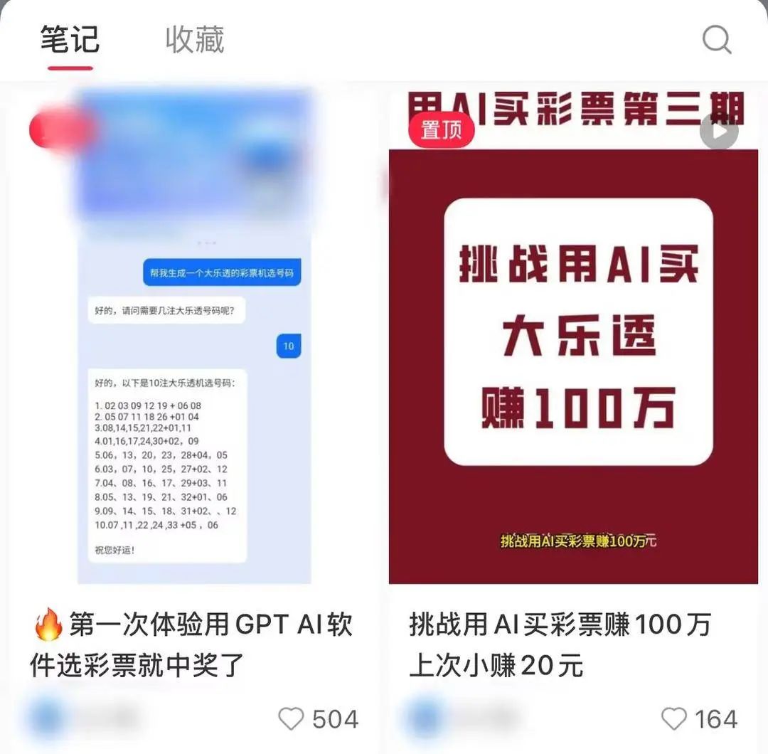 另外,记者发现还有标题为“第一次体验用GPT AI软件选彩票就中奖了”的笔记存在。相关笔记的封面图片中,用户输入“帮我生成一个大乐透的彩票机选号码”,并给出需要10注的指令,AI软件则给出了10注大乐透机选号码。